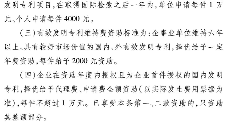 (四)企事業單位維持5年以上、具有較好市場價值的國內有效發明專利,擇優給予一次性專利維持費資助,每件資助額度不超過1萬元。