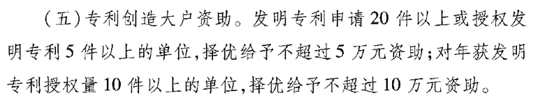 (五)企業年度發明專利授權量超過10件的,在普通資助的基礎上給予獎勵,達到10—20件的獎勵5萬元,21—50件的獎勵10萬元,50件以上的獎勵20萬元;科研院所年度發明專利授權量超過20件的,在普通資助的基礎上給予獎勵,達到20—30件的獎勵5萬元,31—50件獎勵10萬元,50件以上獎勵20萬元;駐濟高校年度發明專利授權量超過100件的,在普通資助的基礎上給予獎勵,達到100—200件的獎勵5萬元,201—300件獎勵10萬元,300件以上獎勵20萬元。