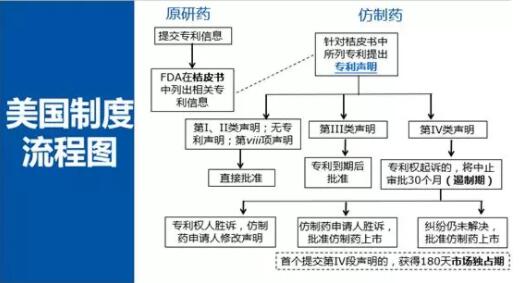 美國鏈接制度從整體上可以分為4大塊:桔皮書制度、專利聲明制度、遏制期制度、首仿藥市場獨占期制度。